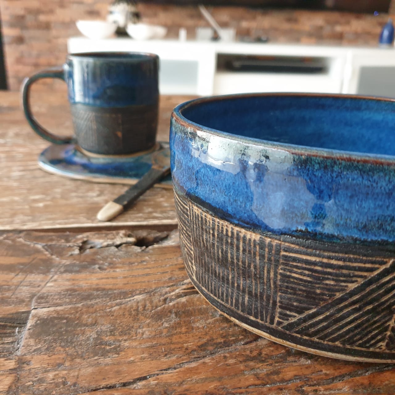 Beautiful ceramic engraved glazed set, consisting of bowl (16cm width × 11cm height) and matching server-tray (30cm length x14cm width) with mug (9cm width×12 cm height) & spoon