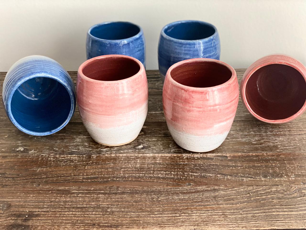 Set of six ceramic mugs in two different glazed colors (3 blueish and 3 pinkish).