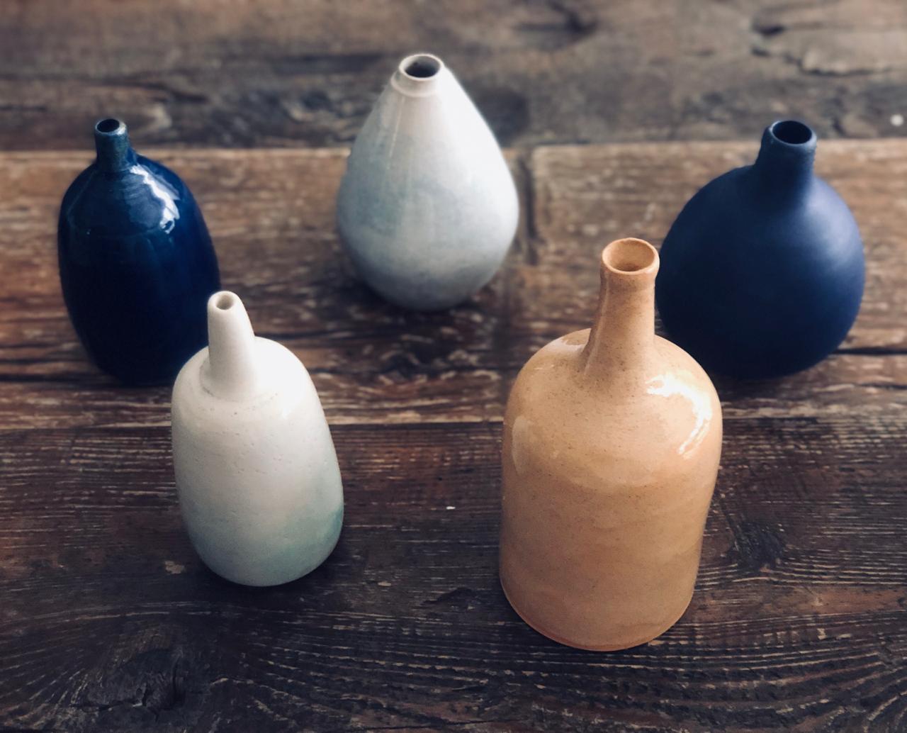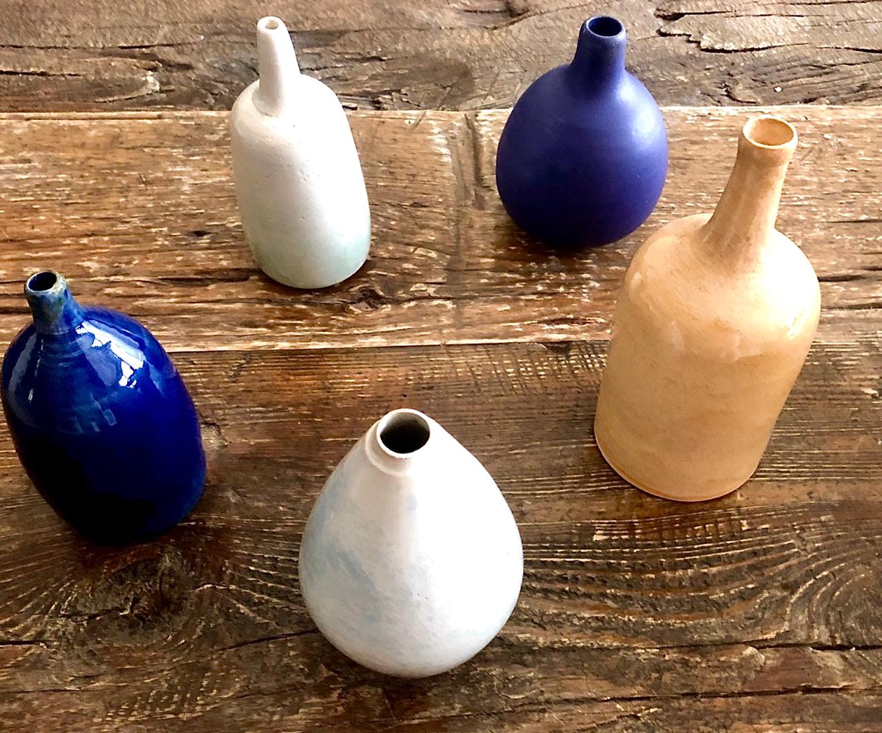 Various unique and custom handmade ceramic glazed single flower vases.